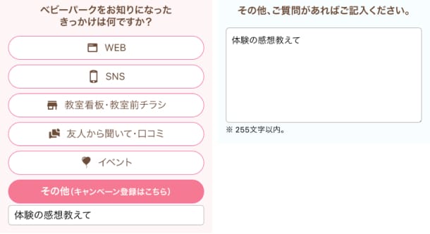 日程確定でお申込みの場合は「ベビーパークをお知りになったきっかけは何ですか?」に、日程未確定でお申込みの場合は「その他、ご質問」にご入力ください。